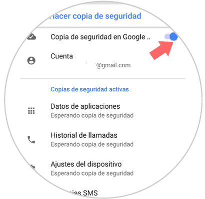 En la nueva pantalla, en la parte superior del todo y en primer lugar deberás activar la pestaña de “Copia de Seguridad de Google” Activa la pestaña para activar la copia de seguridad de Google que se irá realizando de manera periódica y automática guardando los datos de tu teléfono.