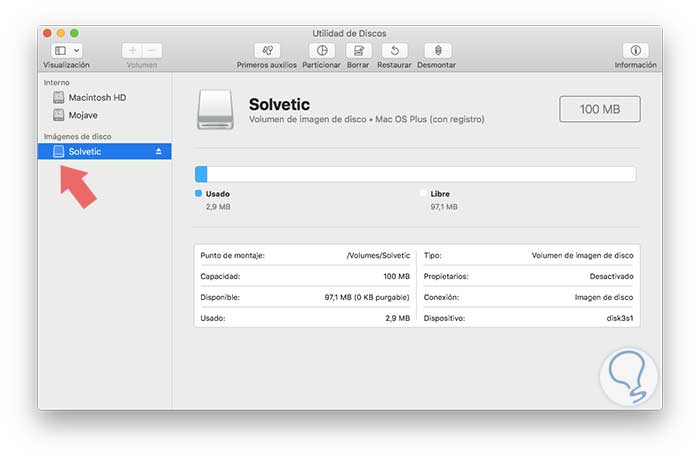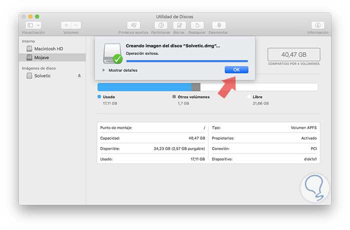 Pulsamos en OK para salir del asistente y ahora veremos esta imagen disponible en la utilidad de discos de macOS Mojave: