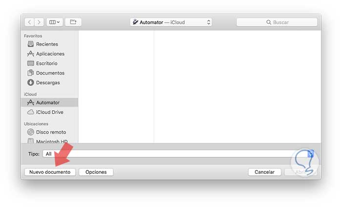 Si queremos usar esta aplicación de forma permanente en el Finder de macOS Mojave, abrimos la aplicación Automator y damos clic en el botón inferior Nuevo documento: