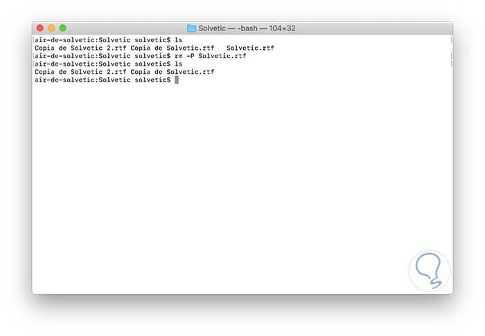rm -P (Archivo)Vamos a listar el contenido con ls, luego ejecutamos el comando anterior y de nuevo usamos ls para validar que el archivo ha sido eliminado de forma segura: