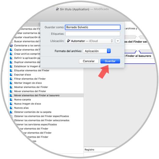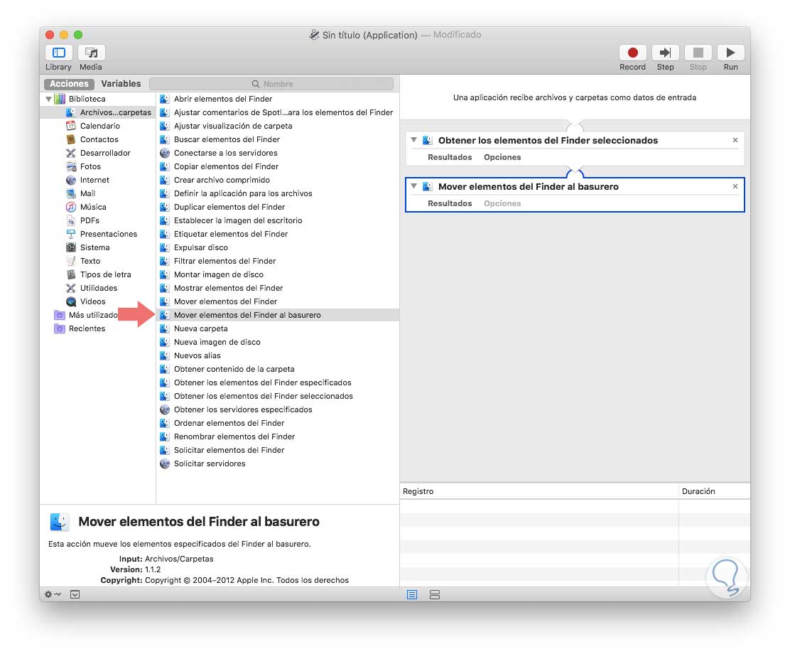 Luego, arrastramos la opción Mover elementos del Finder al basurero:
