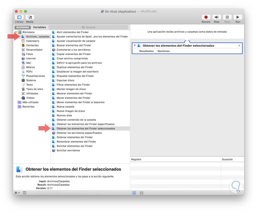Pulsamos en el botón Choose y en la nueva ventana seleccionamos la categoría Archivos y carpetas y allí arrastramos al panel derecho la opción Obtener los elementos del Finder seleccionados: