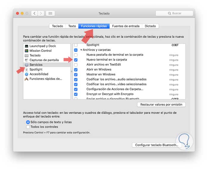 Allí seleccionamos la categoría Teclado y en la ventana que será desplegada vamos a la pestaña Funciones rápidas y allí vamos a la categoría Servicios donde activaremos la casilla Nuevo terminal en la carpeta: