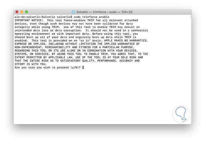 Allí ingresamos la letra y para aceptar y será necesario reiniciar el sistema para aplicar los cambios. Apple no garantiza el uso de la herramienta TRIM y nos advierte que esta debe ser usada bajo nuestra responsabilidad por lo cual Solvetic aconseja crear una copia de seguridad antes de proceder con esta habilitación.
