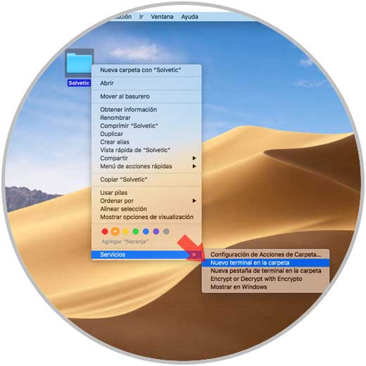 Ahora iremos a la carpeta donde se encuentran almacenados los archivos que vamos a eliminar de forma segura, daremos clic derecho (Ctrl + clic) sobre ella y vamos a la línea Servicios y allí seleccionamos la opción Nuevo terminal en la carpeta: