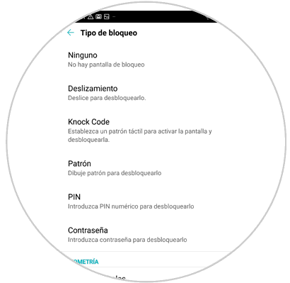 Aquí podrás elegir entre distintos tipos de bloqueo para la pantalla: