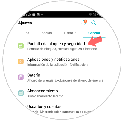 Una vez dentro, en la barra superior donde podrás diferenciar distintos apartados, pulsa en “General” y en el listado pulsa sobre la opción “Pantalla de bloqueo y seguridad”
