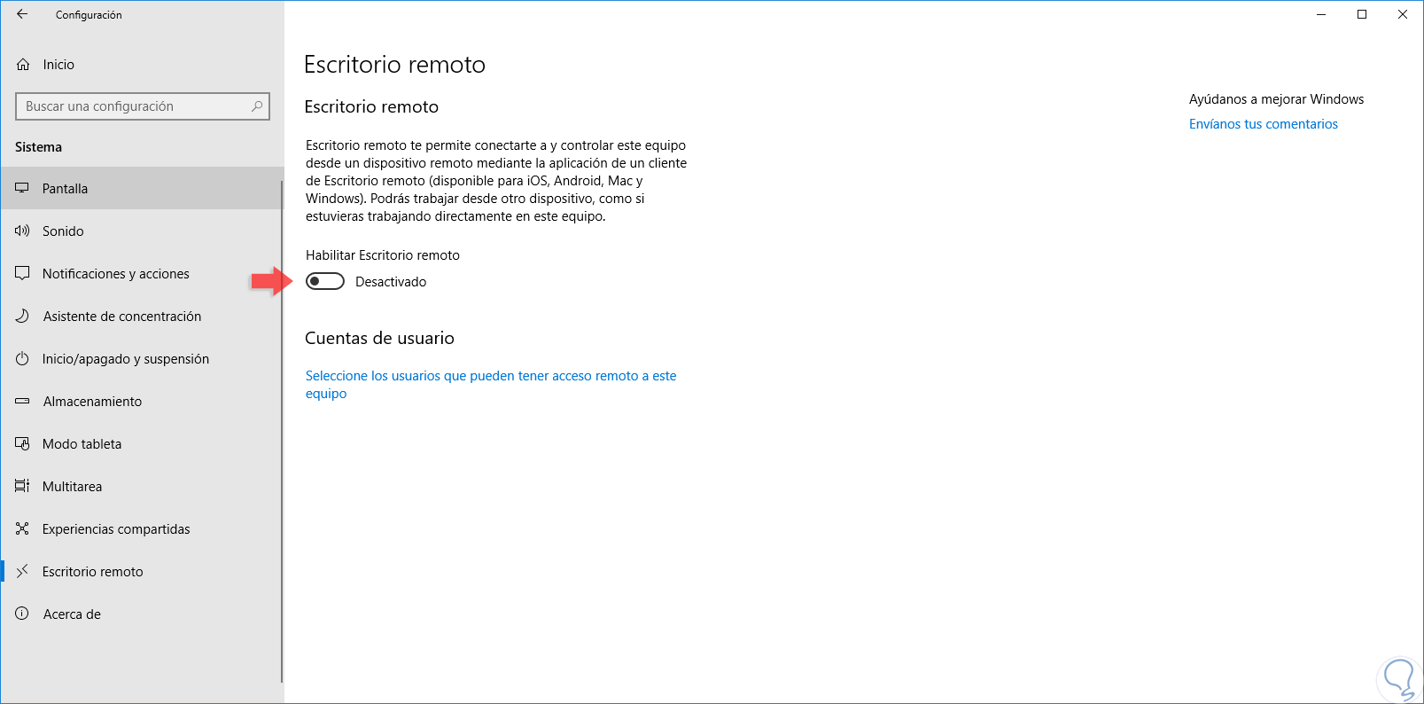 Allí seleccionamos la categoría “Sistema” y en la ventana desplegada vamos a la categoría “Escritorio remoto” donde veremos que por defecto está inhabilitado: