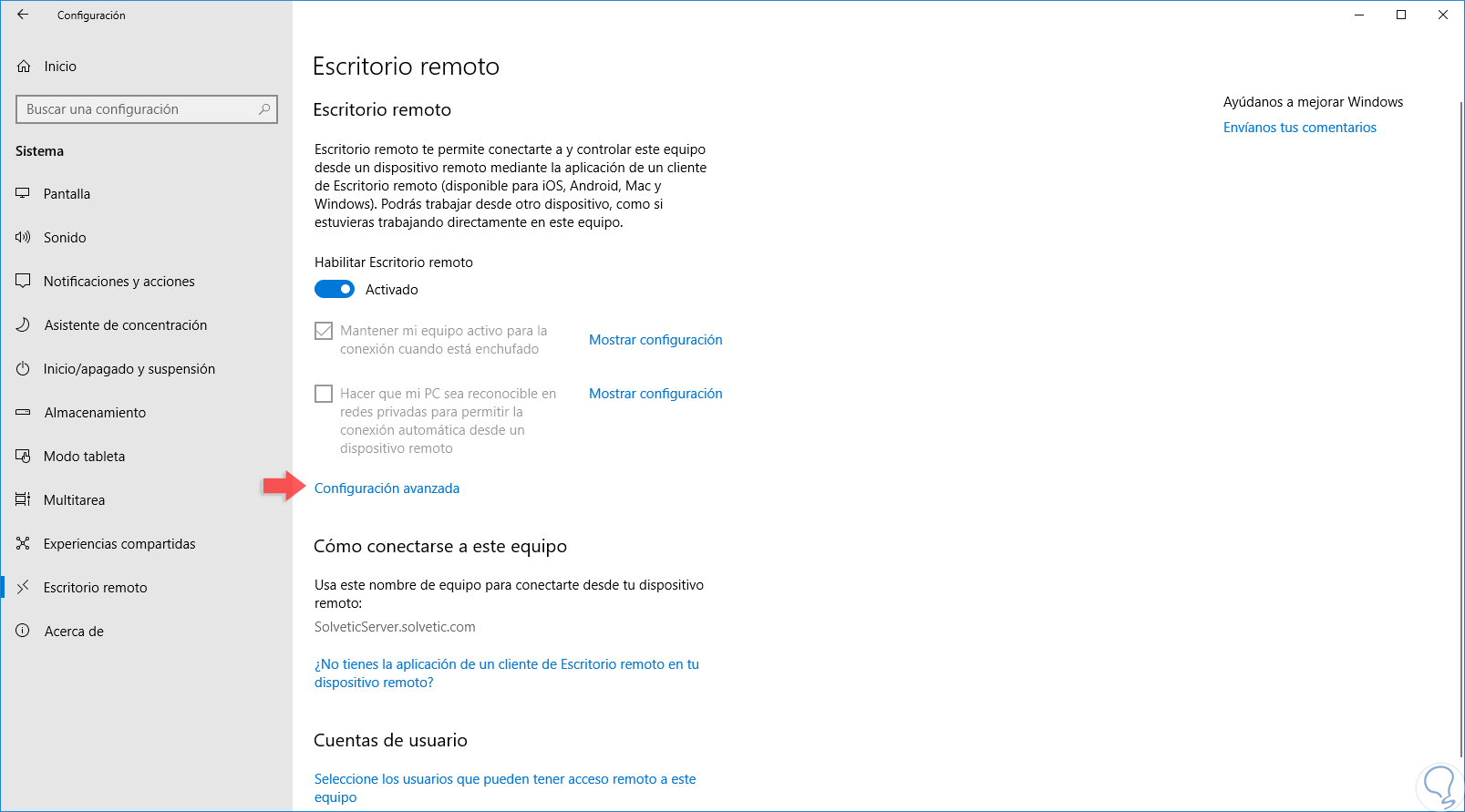 Para habilitar el escritorio remoto usando el Panel de control debemos ir a la siguiente ruta: