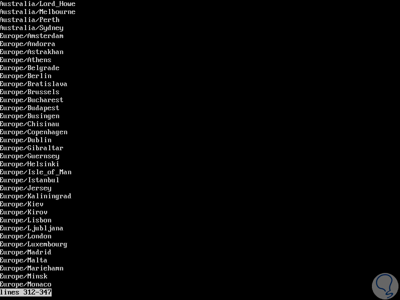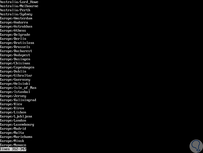timedatectl list-timezonesSerán desplegadas todas las zonas que podemos usar y para navegar entre ellas usaremos las teclas de dirección de nuestro teclado. Allí debemos tener presente la línea de la zona horaria que deseamos aplicar a Ubuntu 18.04.