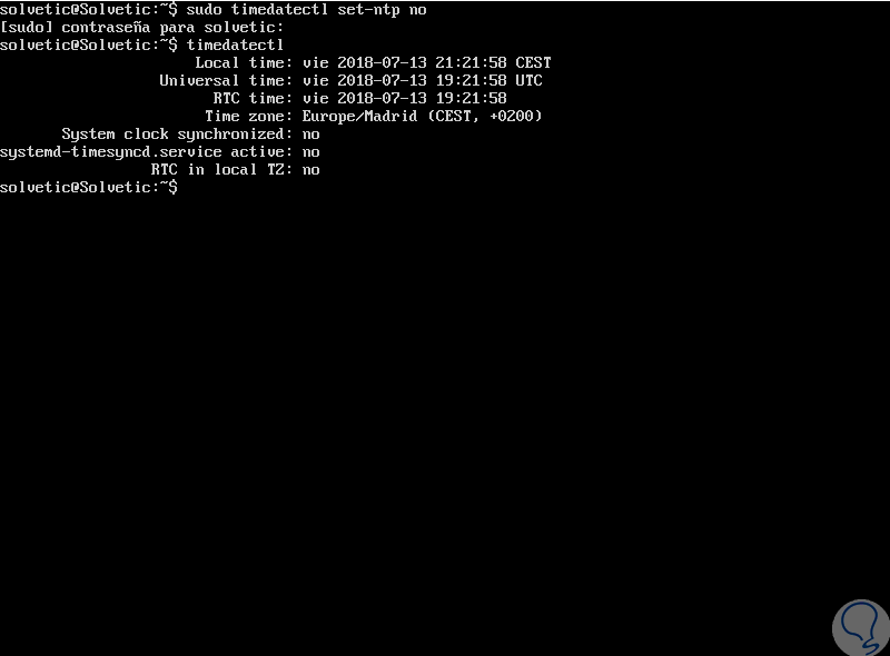 sudo timedatectl set-ntp noValidamos la desactivacion ejeuctando timedatectl el cual ahora tiene como respuesta no: