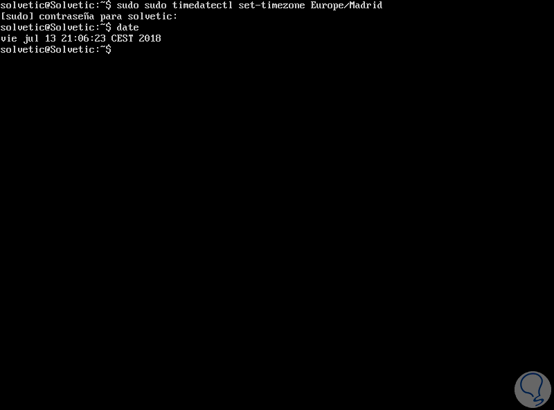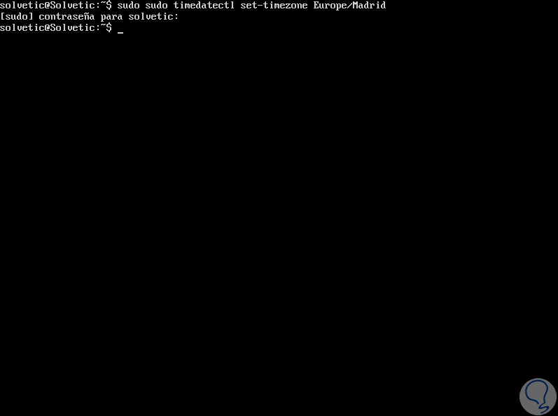 sudo timedatectl set-timezone Europe/MadridIngresamos la contraseña de nuestro usuario y el cambio se aplicará de forma correcta: