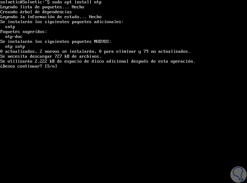 sudo apt install ntpIngresamos la letra S para confirmar la descarga e instalación de NTP en Ubuntu 18.04.