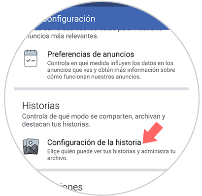Lo siguiente que debes hacer es irte desplazando hacia abajo, hasta llegar al apartado de Historias. Una vez aquí debes seleccionar "Configuración de la historia"