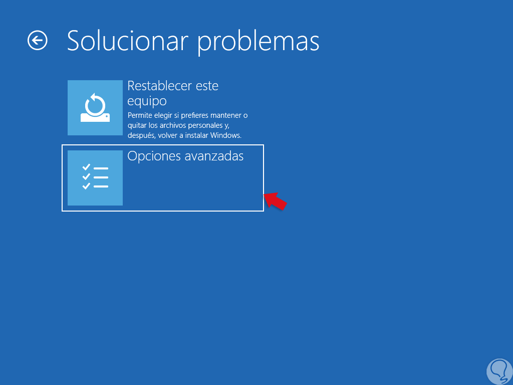 Pulsamos en “Solucionar problemas” y en la siguiente ventana vamos a Opciones avanzadas: