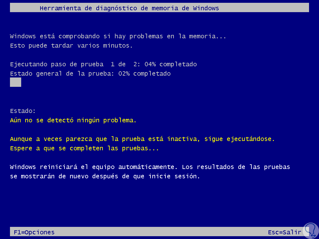 Si pulsamos la tecla F accederemos a los modos de prueba y demás opciones de la herramienta. En la línea “Estado” veremos los errores, si existen, que son detectados. En este caso esperamos que se completen las dos pruebas por defecto y el sistema será reiniciado una vez el proceso culmine. Podemos ver que los resultados de la prueba serán desplegados después de reiniciar el equipo solo si se han detectado errores.