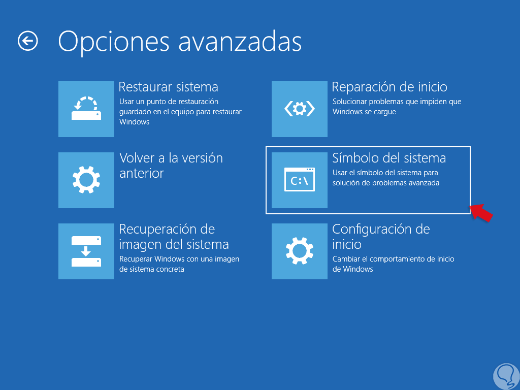 Seleccionamos “Opciones avanzadas” y en la nueva ventana seleccionamos “Símbolo del sistema”: