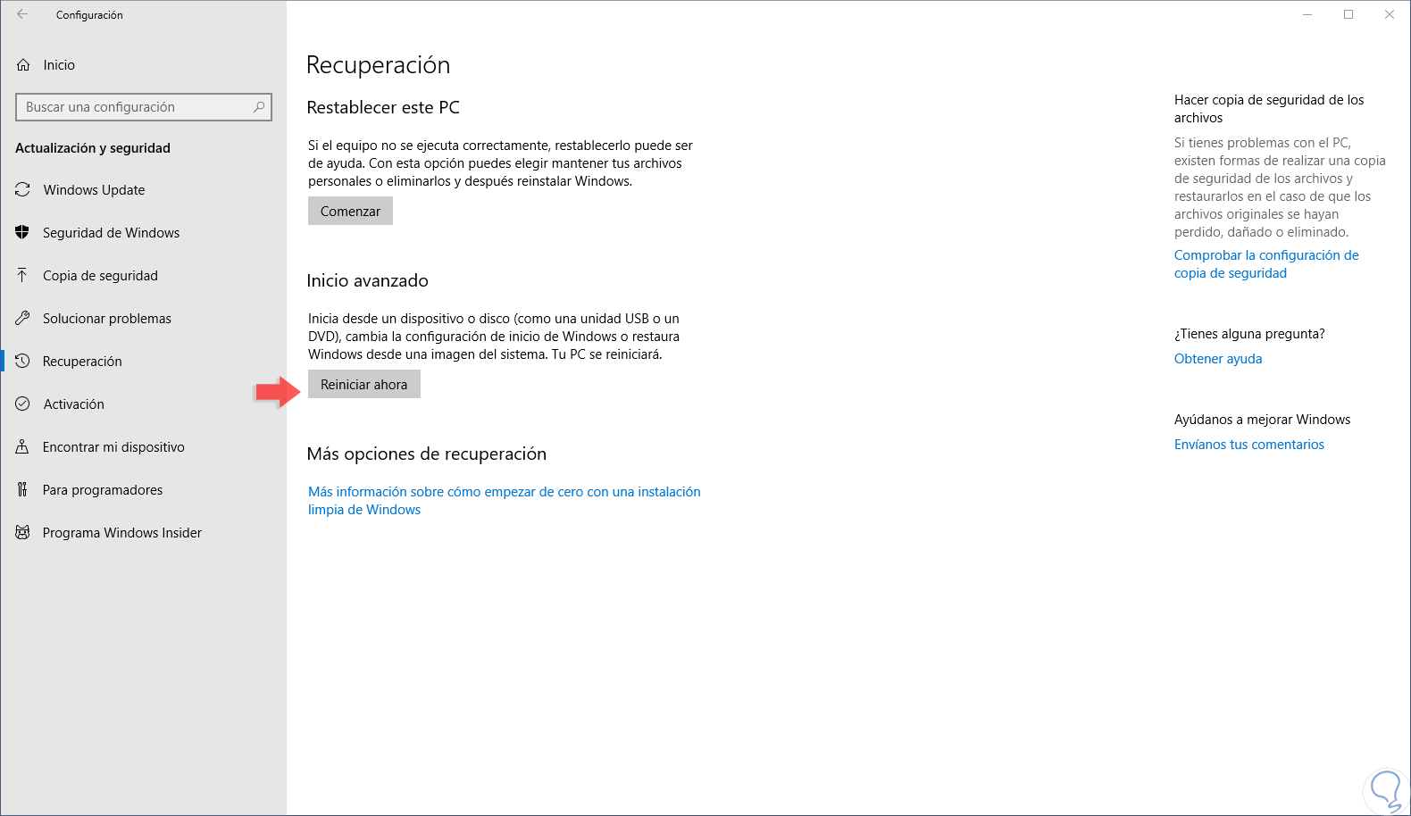 - Ir a la ruta siguiente y allí pulsar en el botón “Reiniciar ahora” ubicado en la sección “Inicio avanzado”: