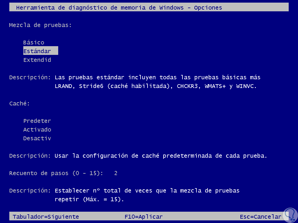 Cuando se esté ejecutando la utilidad, es posible hacer clic sobre la tecla F1 para ver opciones avanzadas de la herramienta y allí seleccionar un tipo de prueba especifico, con la prueba "Estándar" el tiempo estimado es de alrededor de 30 minutos. La prueba Extendida puede tardar unas horas en completarse por lo cual se requiere de tiempo para ello.