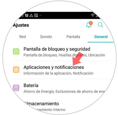 En la barra superior toca en el apartado “General” y desliza entre las opciones hasta encontrar “Aplicaciones y notificaciones”, pulsa aquí.
