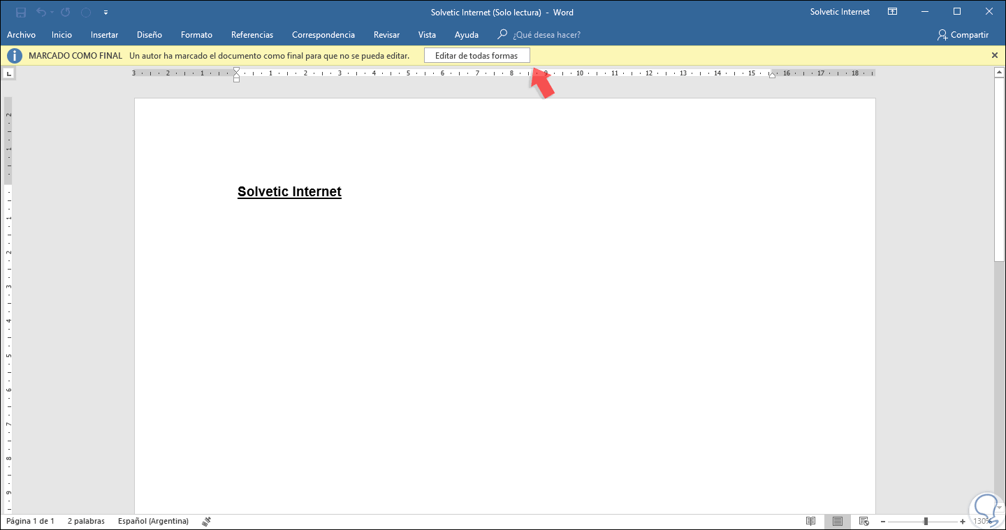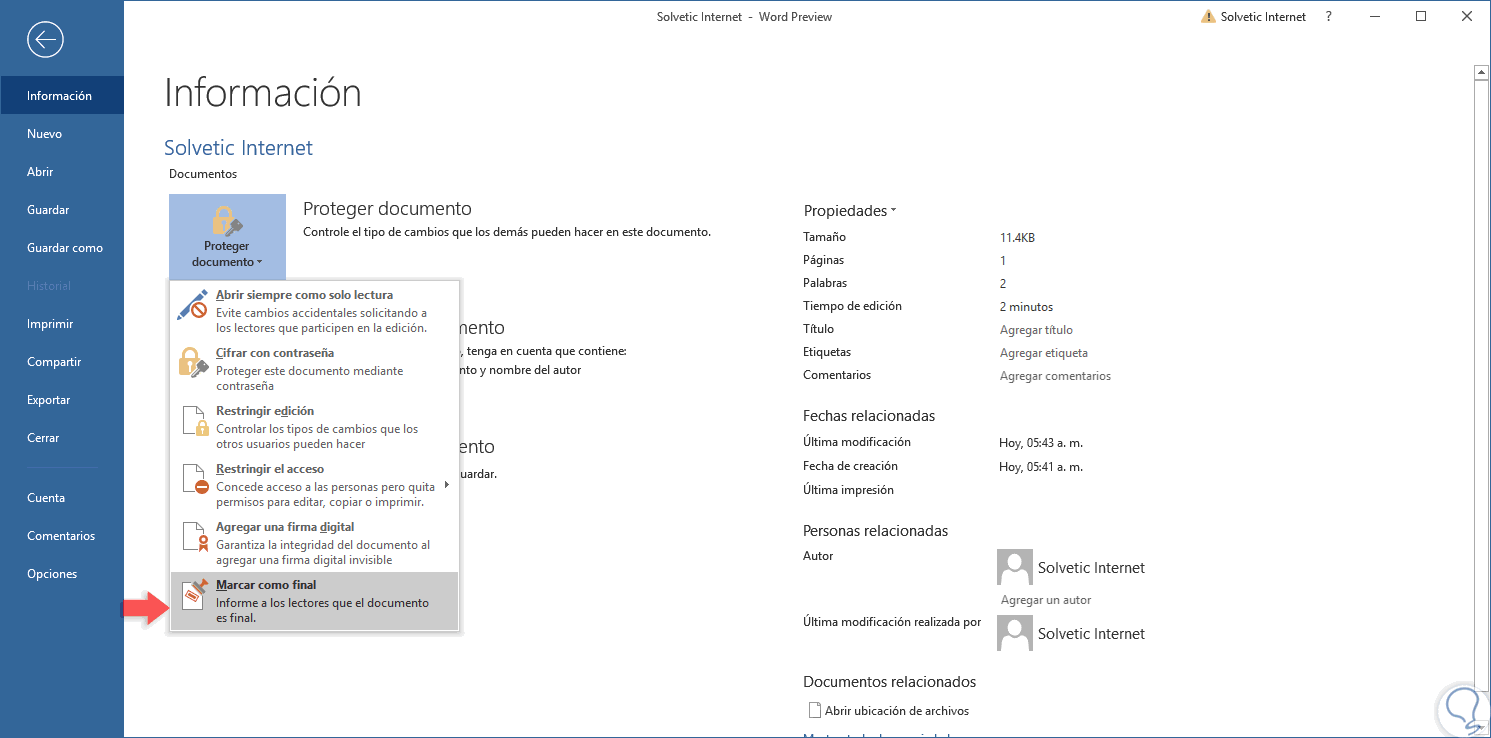 Ahora, cuando accedamos de nuevo al documento marcado como final veremos lo siguiente: