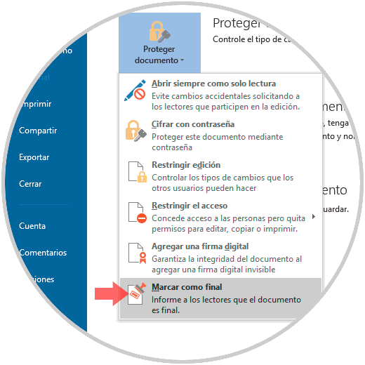 Gracias a la opción Marcar como final de Microsoft Word, será posible hacer que el archivo trabajado, no solamente de Word sino también de Excel o PowerPoint sea de solo lectura. Esto aumenta la seguridad de éste ya que al activar y usar la opción de marcar como final un archivo especifico, tanto la escritura como los comandos de edición y las marcas de revisión se deshabilitan o desactivan y así ningún otro usuario podrá realizar cambios en dicho archivo. Además de esto, el archivo pasa a ser de solo lectura y la propiedad Estado del documento se define como Final.