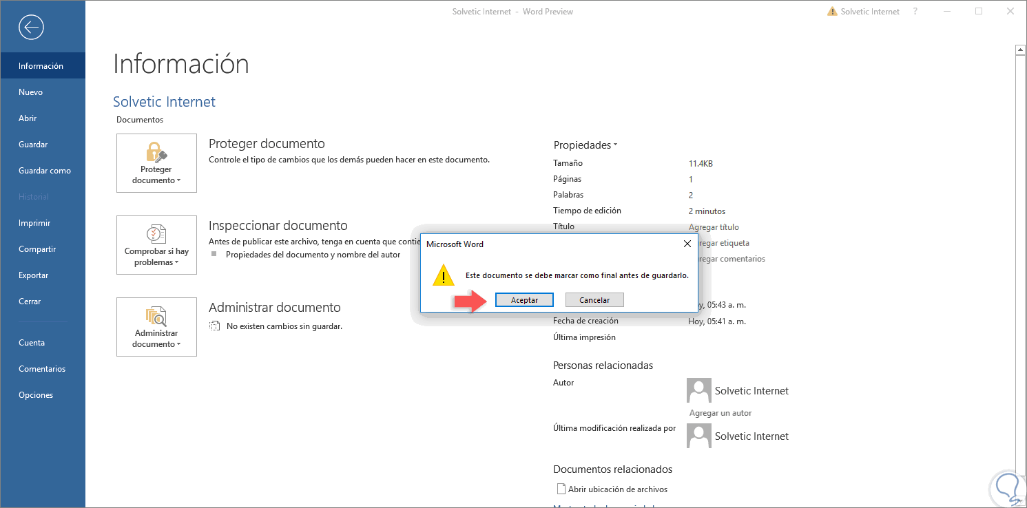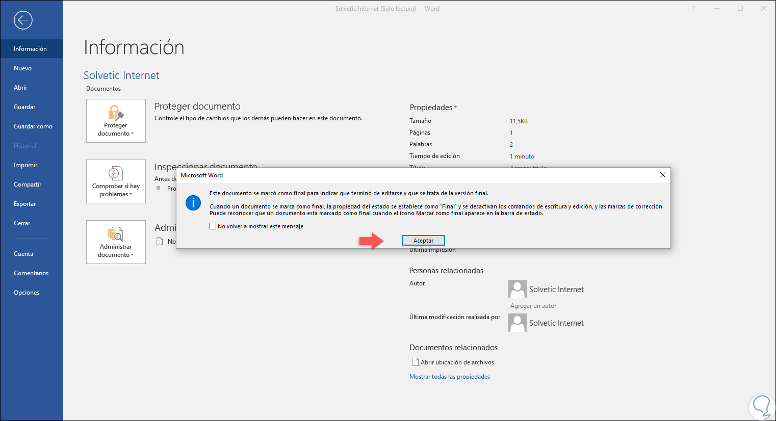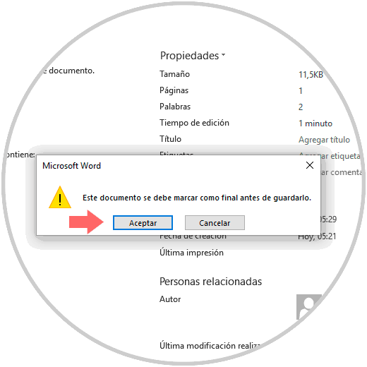 Pulsamos en Aceptar y se confirma la marcación como final del documento en Word 2019: