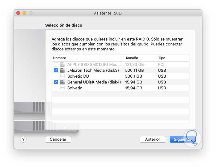 Ahora, en la siguiente ventana activamos las casillas del o los discos que vamos a usar para crear nuestro RAID 0 en macOS Mojave: