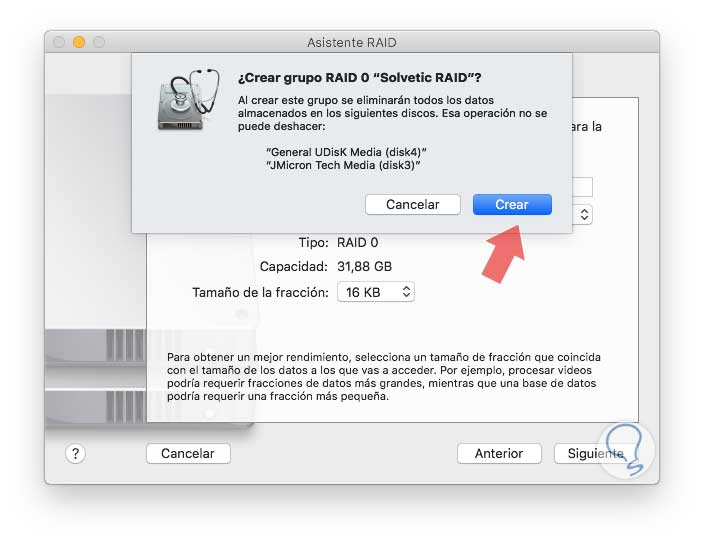 Pulsamos en el botón Crear para dar inicio al proceso de creación del grupo RAID en macOS Mojave: