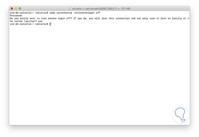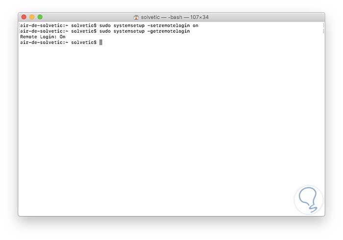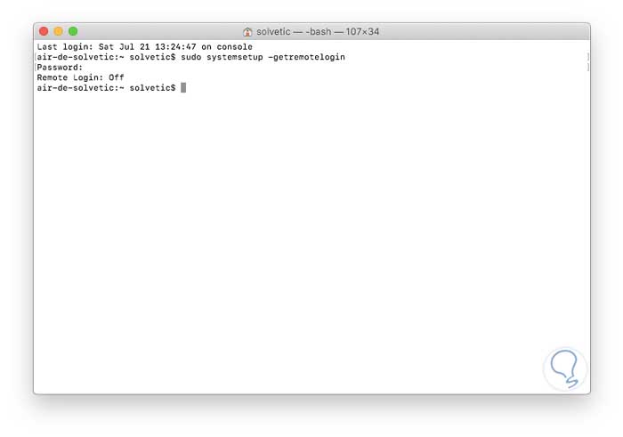sudo systemsetup -getremoteloginIngresamos nuestra contraseña y este será el resultado.