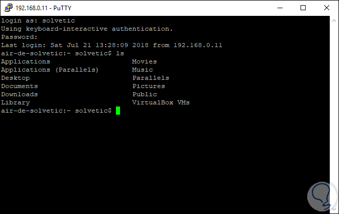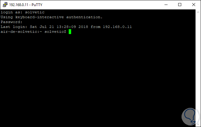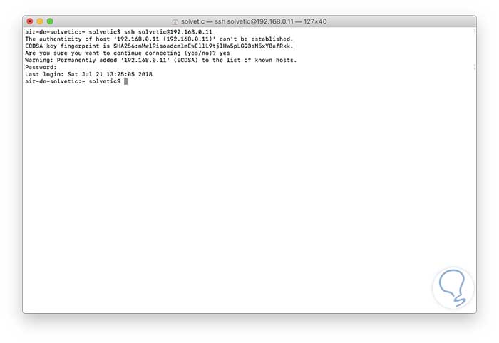 ssh solvetic@192.168.0.11Una vez realicemos este proceso el usuario tendrá el acceso al equipo y en caso de ser un usuario administrador deberá suministrar las respectivas credenciales de acceso al mismo: