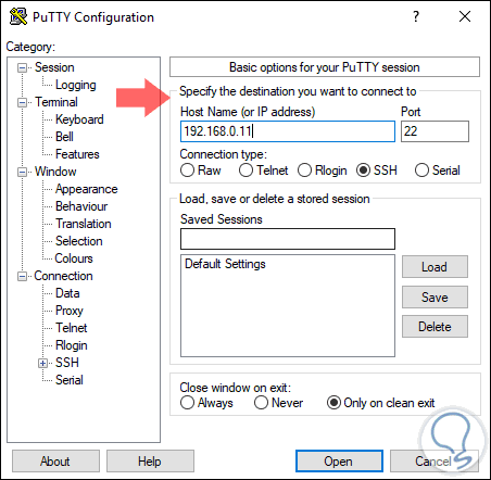 - El tipo de conexión en el campo Connection Type debe estar como SSH