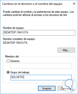 Desde este punto, será posible unirnos a cualquier grupo de trabajo existente en la red local o bien unirnos a un nuevo dominio si estamos en un ambiente corporativo, cabe anotar que, si es requerido, tendremos la oportunidad de crear un nuevo grupo de trabajo en Windows 10.