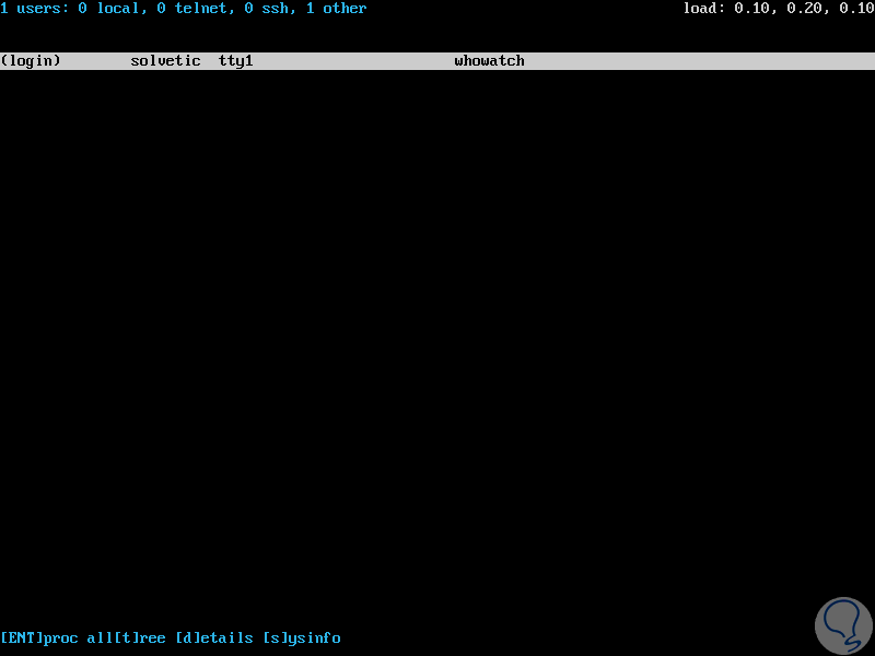 Una vez instalado, basta con ejecutar whowatch en la línea de comando, donde veremos el usuario que ha iniciado sesión y su tipo de conexión.