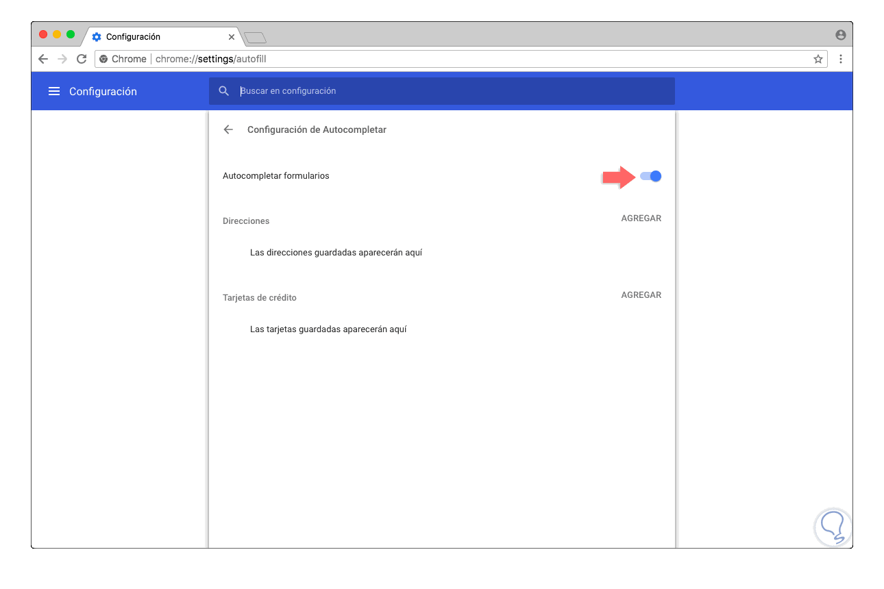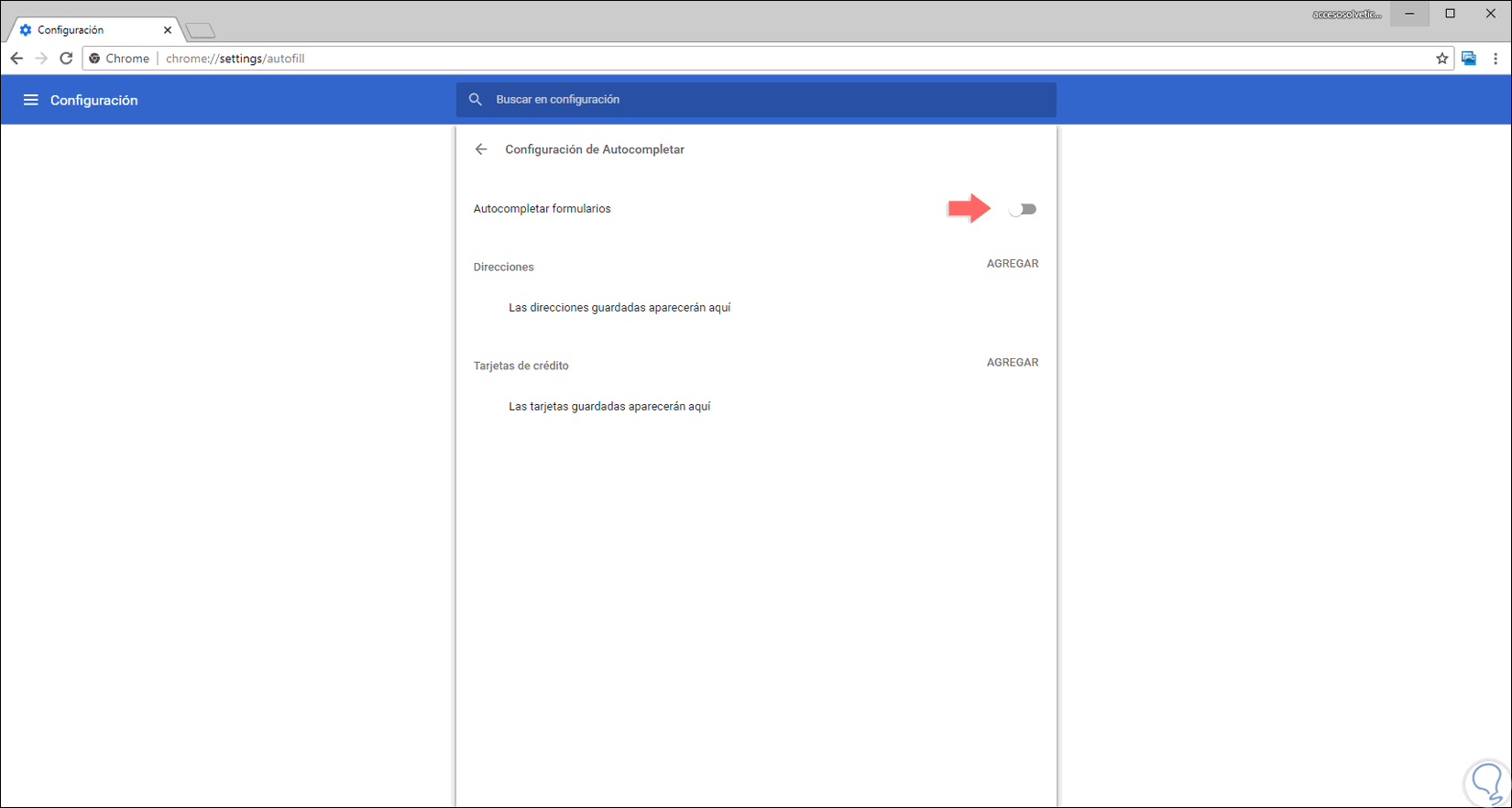 Allí básicamente tenemos la opción de habilitar o deshabilitar la función de autocompletar formularios y para ello basta con pulsar en el respectivo interruptor. Si deseamos, podemos añadir el autocompletado de algunas direcciones web o tarjetas de crédito, pero por motivos de seguridad no es recomendable hacerlo.