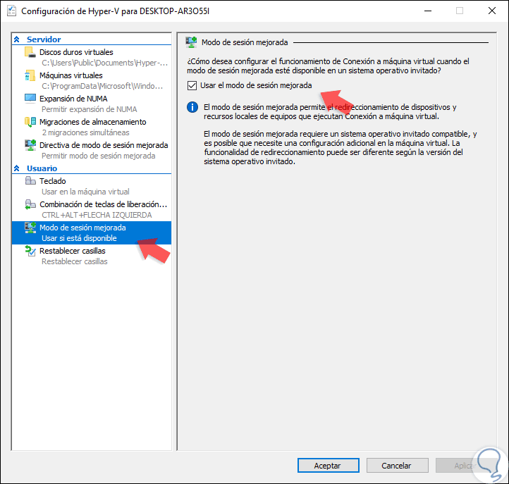 En la ventana desplegada vamos a la sección “Modo de sesión mejorada” y activamos la casilla “Usar el modo de sesión mejorada” en el costado derecho: