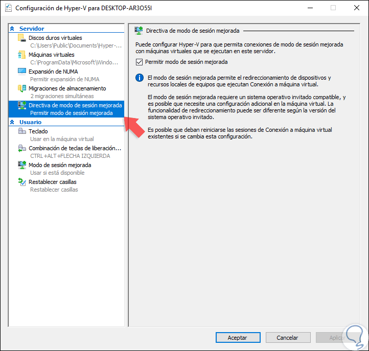 Pulsamos en Aplicar y Aceptar para guardar los cambios. El punto radica en que, aunque allí este activa la opción, no siempre la sesión mejorada se ejecuta como debe ser, debemos ir a la sección “Directiva de modo de sesión mejorada” la cual es una directiva interna de Hyper-V con la cual se permite o no el uso de la sesión mejorada en las máquinas virtuales de Hyper-V. Al pulsar allí veremos lo siguiente: