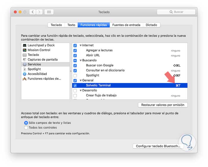 Allí seleccionamos la categoría Teclado e iremos a la pestaña Funciones rápidas, allí seleccionamos la categoría Servicios y ubicaremos nuestro flujo creado: