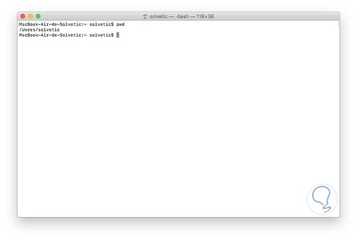 En macOS siempre trabajamos en un directorio de trabajo, de modo que si no sabemos con certeza en cual directorio estamos, podemos usar el comando pwd (print working directory) para desplegar esta información: