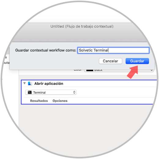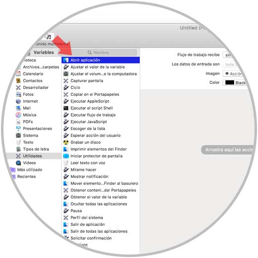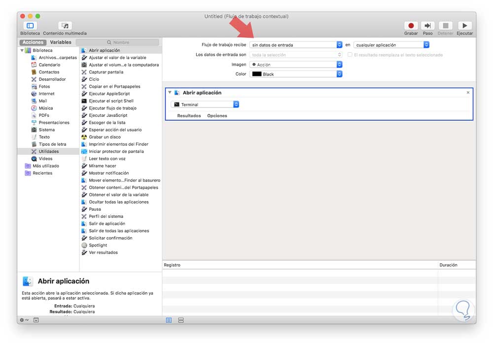 Ahora, arrastramos la opción Abrir aplicación al costado lateral derecho y pulsamos sobre el campo desplegable para seleccionar Terminal: