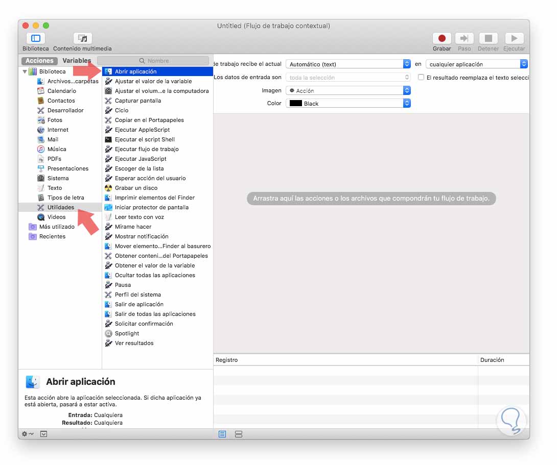 Al pulsar allí, ahora vamos a la columna lateral izquierda y en la sección Bibliotecas damos clic sobre Utilidades y en el panel central seleccionamos la línea Abrir aplicación: