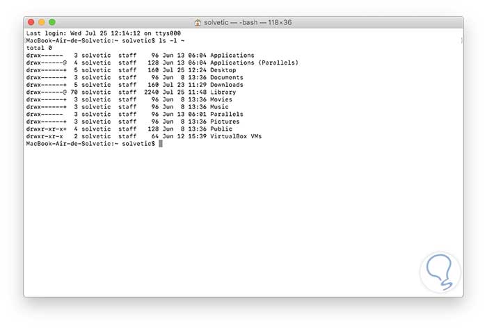 Podemos ver los detalles de cada librería de macOS, en este caso el comando ls nos permite listar una serie de atributos según se ejecute el comando, el parámetro -l (long), se encarga de listar los nombres de los archivos y el parámetro ~ es un nombre abreviado para seleccionar la carpeta de inicio del usuario actual.