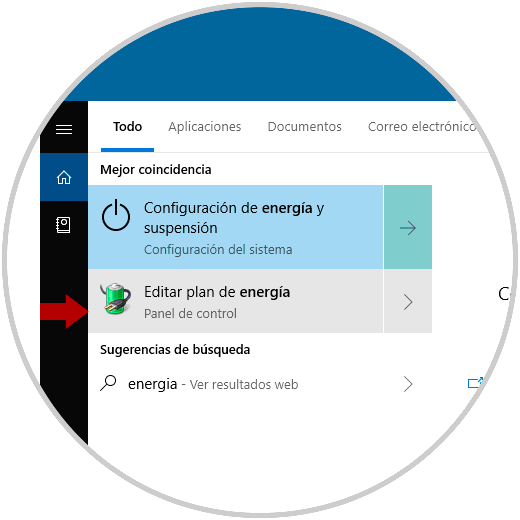 Para usar este método basta con ingresar el término “energía” en el cuadro de búsqueda y allí seleccionar “Editar plan de energía”: