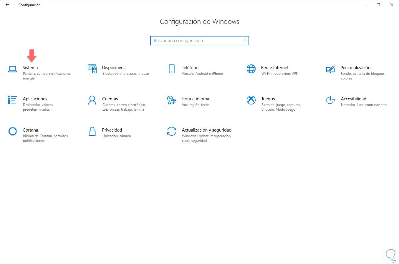 Para usar esta opción vamos al menú Inicio y allí seleccionamos la utilidad Configuración donde veremos lo siguiente: