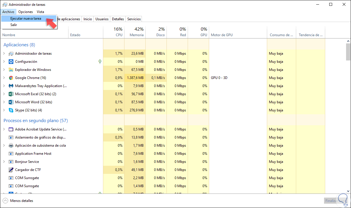 Para acceder al administrador de tareas daremos clic derecho sobre la barra de tareas y allí seleccionamos el Administrador, y en la ventana desplegada vamos al menú “Archivo / Ejecutar nueva tarea”: