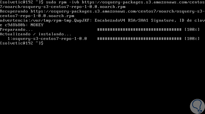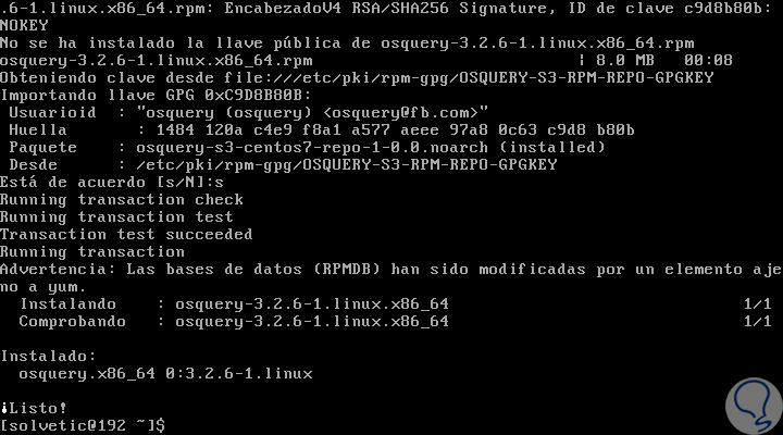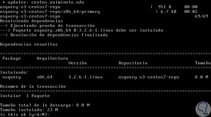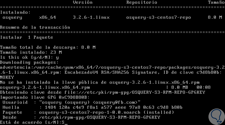 Ingresamos la letra s para confirmar esto y veremos que se instala de forma correcta OSQuery en CentOS 7.