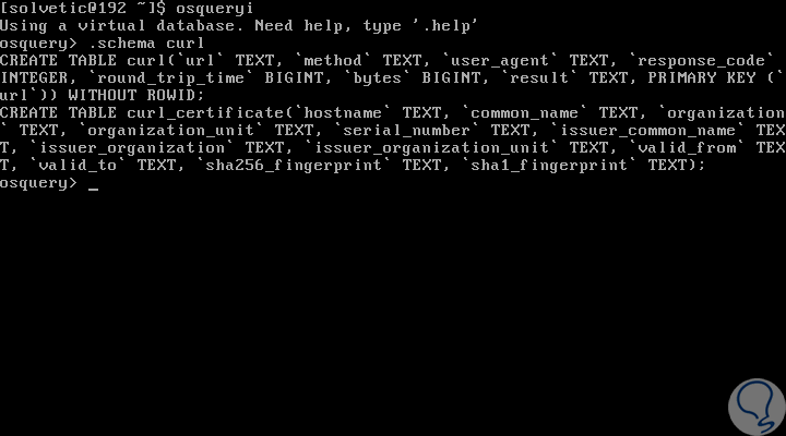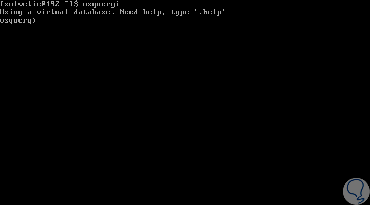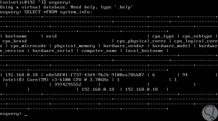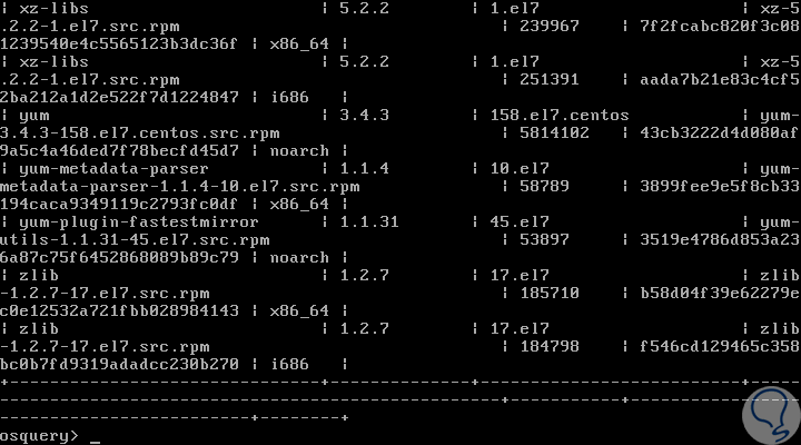 Una vez instalado de forma correcta OSQuery en CentOS 7, vamos a iniciar el shell osqueryi para dar inicio a las consultas del estado del sistema operativo, para ello ejecutamos: