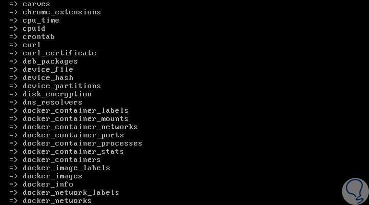 OSQuery hace uso de un plugin simple y de una API de extensiones con el fin de implementar tablas SQL, pero allí ya existe una colección de tablas listas para su uso, algunas de estas tablas solo están disponibles para un sistema especial, por ejemplo, en el caso de Linux solo veremos la tabla kernel_modules.