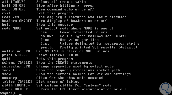 - Posee una consola de consulta interactiva, llamada osqueryi, la cual es una interfaz SQL desarrollada probar nuevas consultas y explorar a fondo el sistema operativo, esta consola posee todos los beneficios del lenguaje SQL completo y cuenta con cientos de tablas integradas las cuales serán vitales ante respuesta a incidentes, diagnósticos de problema a nivel de operaciones del sistema y más.