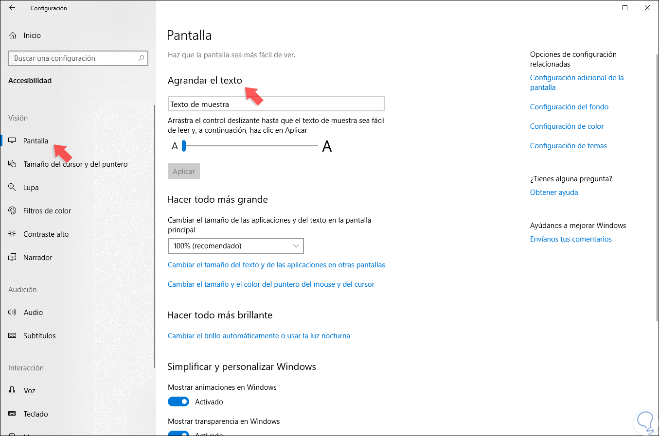 Damos clic en la categoría “Accesibilidad” y en las opciones desplegadas vamos a la categoría “Pantalla”: